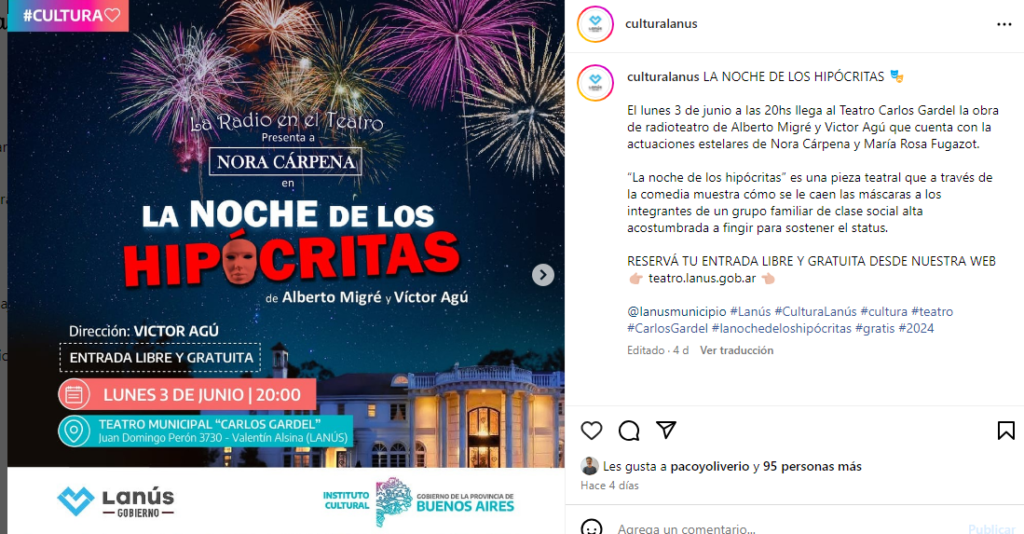 Cultura Lanús invita a los vecinos a ver la obra “La noche de los hipócritas” el próximo lunes 3 de junio a las 20 horas en el Teatro Municipal Carlos Gardel en Juan Domingo Perón 3730, Valentín Alsina de forma libre y gratuita.