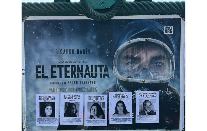 La ciudad de Buenos Aires, escenario de la invasión que narra El Eternauta, está empapelada con afiches de la serie de Netflix que dirige Bruno Stagnaro y protagoniza Ricardo Darín. Muchos de esos afiches fueron intervenidos por manos anónimas que les pegaron volantes con los rostros de Oesterheld y sus cuatro hijas. Los cinco fueron asesinados por el terrorismo de Estado, sólo se recuperó un cuerpo y se ignora el destino de dos niños nacidos en cautiverio.