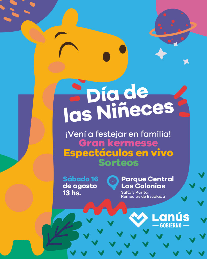 Lanús Gobierno invita a chicos y chicas a celebrar en familia el Día de las Niñeces, este sábado 16 de agosto a partir de las 13 horas. En un evento libre y gratuito, el Parque Central Las Colonias, ubicado sobre las calles Salta y Purita, será el lugar de encuentro.