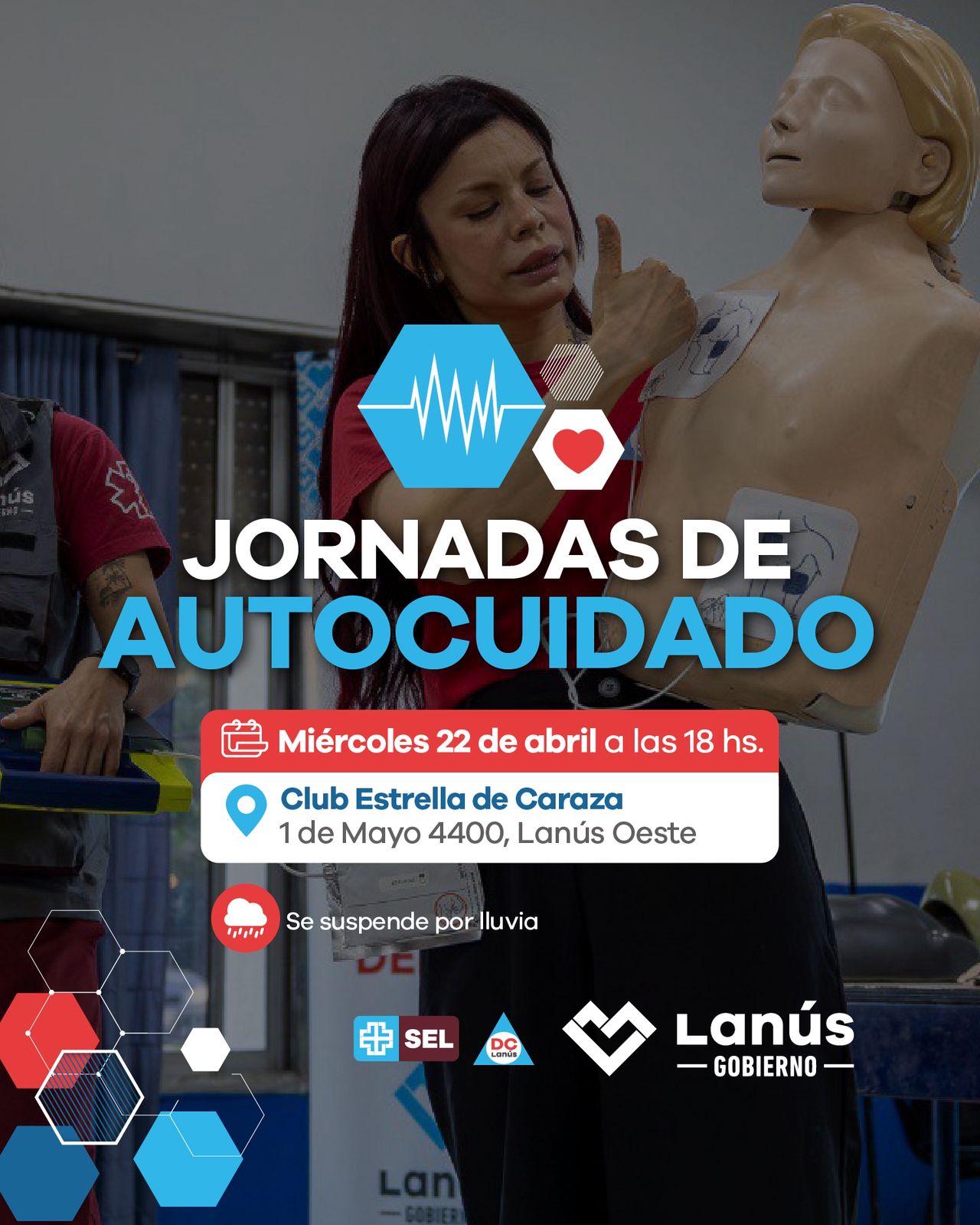 Lanús Gobierno invita a los vecinos y las vecinas a participar de una nueva jornada de autocuidado que tendrá lugar el miércoles 22 de abril, desde las 18, en el Club Estrella de Caraza (1° de Mayo N° 4400, Lanús Oeste), con el objetivo de que los ciudadanos y las ciudadanas puedan incorporar herramientas para actuar con rapidez y eficacia ante situaciones de emergencias médicas.