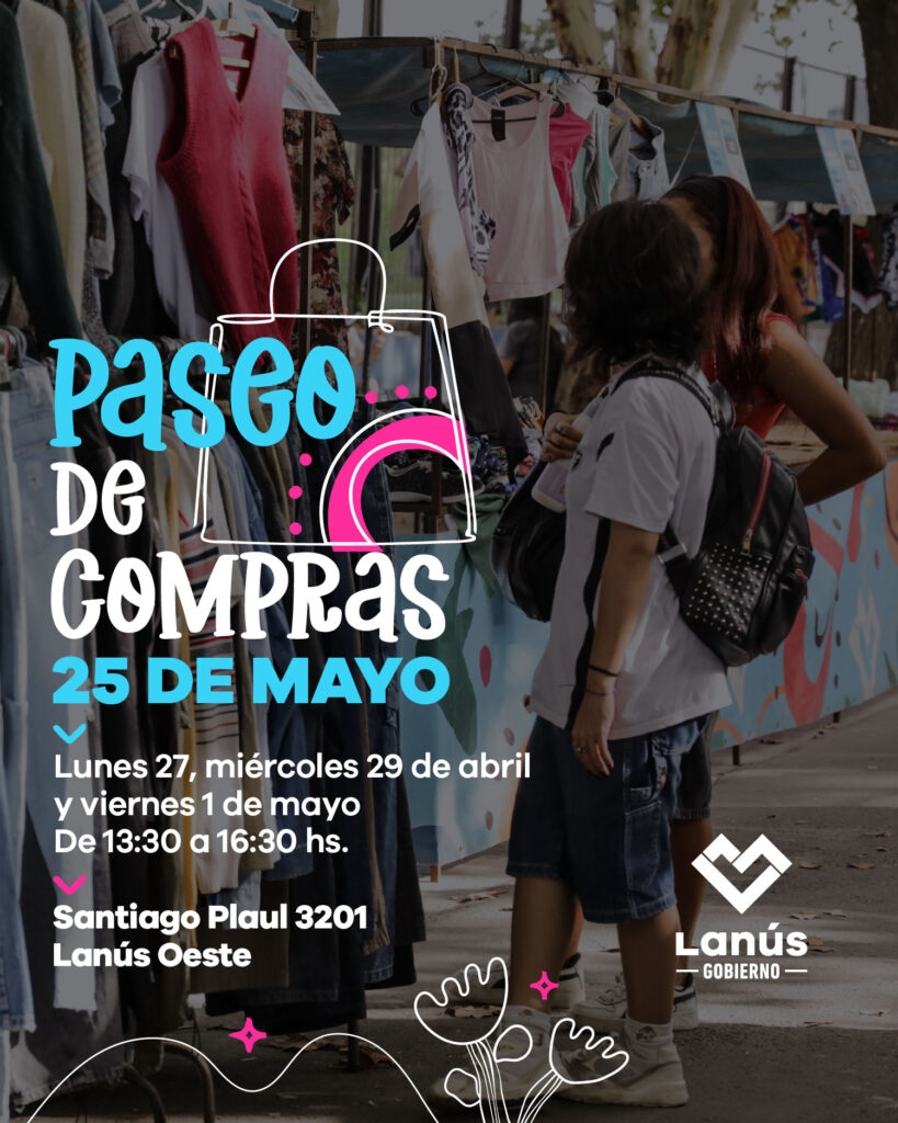 Lanús Gobierno informa que el lunes 27, miércoles 29 de abril y viernes 1 de mayo, de 13:30 a 16:30, se llevará a cabo una nueva edición del Paseo de Compras 25 de Mayo, ubicado en Santiago Plaul N° 3201, en Lanús Oeste.
